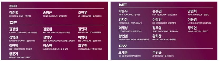 ➡️ 공격수(FW) : 오세훈(FC 마치다 젤비아), 주민규(울산 HD FC)