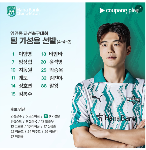 내용과 결과가 크게 중요하지 않은 자선축구대회 이벤트 경기였지만 임영웅을 비록산 출전 선수들은 킥오프 되자 진지한 모습으로 경기를 임했고 총 7골이 터지는 난타전 끝에 팀 기성용이 4-3으로 역전승을 거뒀다.