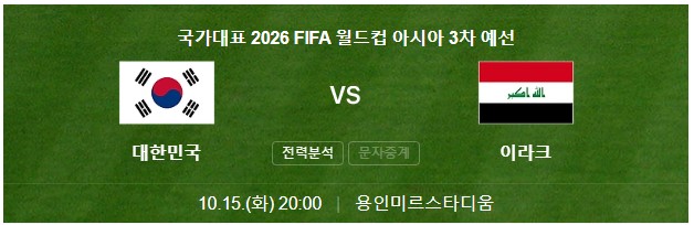 ;2026년 북중미 월드컵 대한민국과 이라크와의 월드컵 3차 예선전, B조 4차전이 10월15(화)에 있습니다. 이라크와의 경기는 홈경기로 '용인 미르스타디움'에서 대한민국 국가대표선수단이 뛰게됩니다.